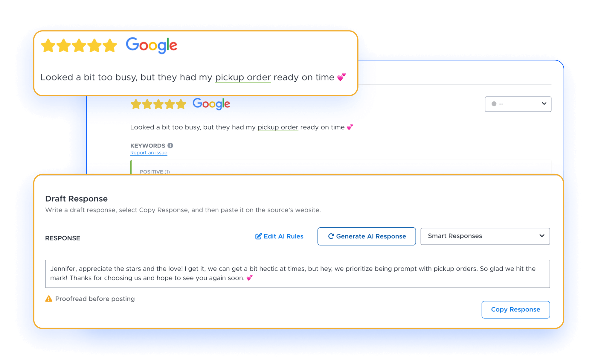 Contamos con respuestas prediseñadas y opciones impulsadas por IA que se ajustan a la calificación y comentario de los usuarios, haciendo que tus clientes se sientan valorados.