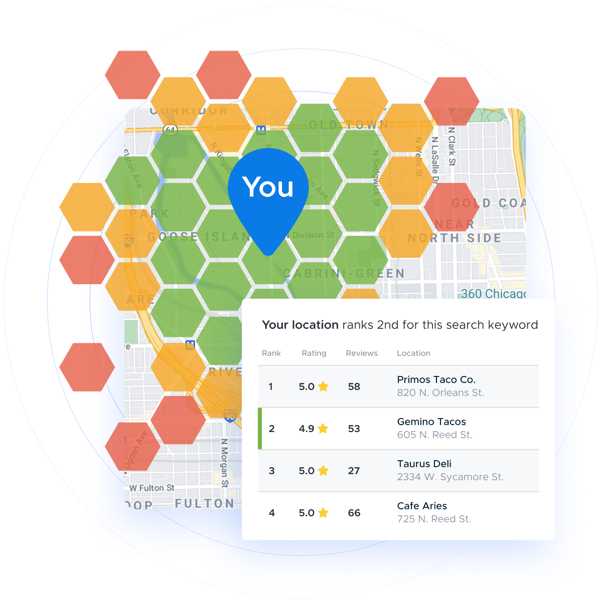 Analizamos las reseñas, puntuación y palabras clave de hasta 10 competidores por ubicación, ofreciéndote una visión clara de tu posición y áreas de mejora.
